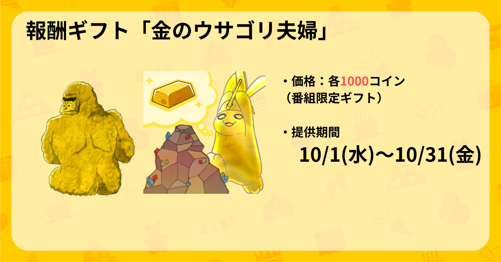 両ギフトで獲得したギフトの総スコアが60,000 kyunを超えた方には、一か月間使える「金の鉱山ウサギ」「金のゴリラ」(各1,000コイン)が実装されます。