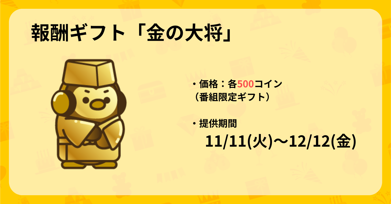 本イベント期間中にイベント限定ギフトから獲得した総獲得点数(点)が70,000 点を超えた方には、特別報酬ギフト「金の大将」を「番組限定」ギフトとして実装。